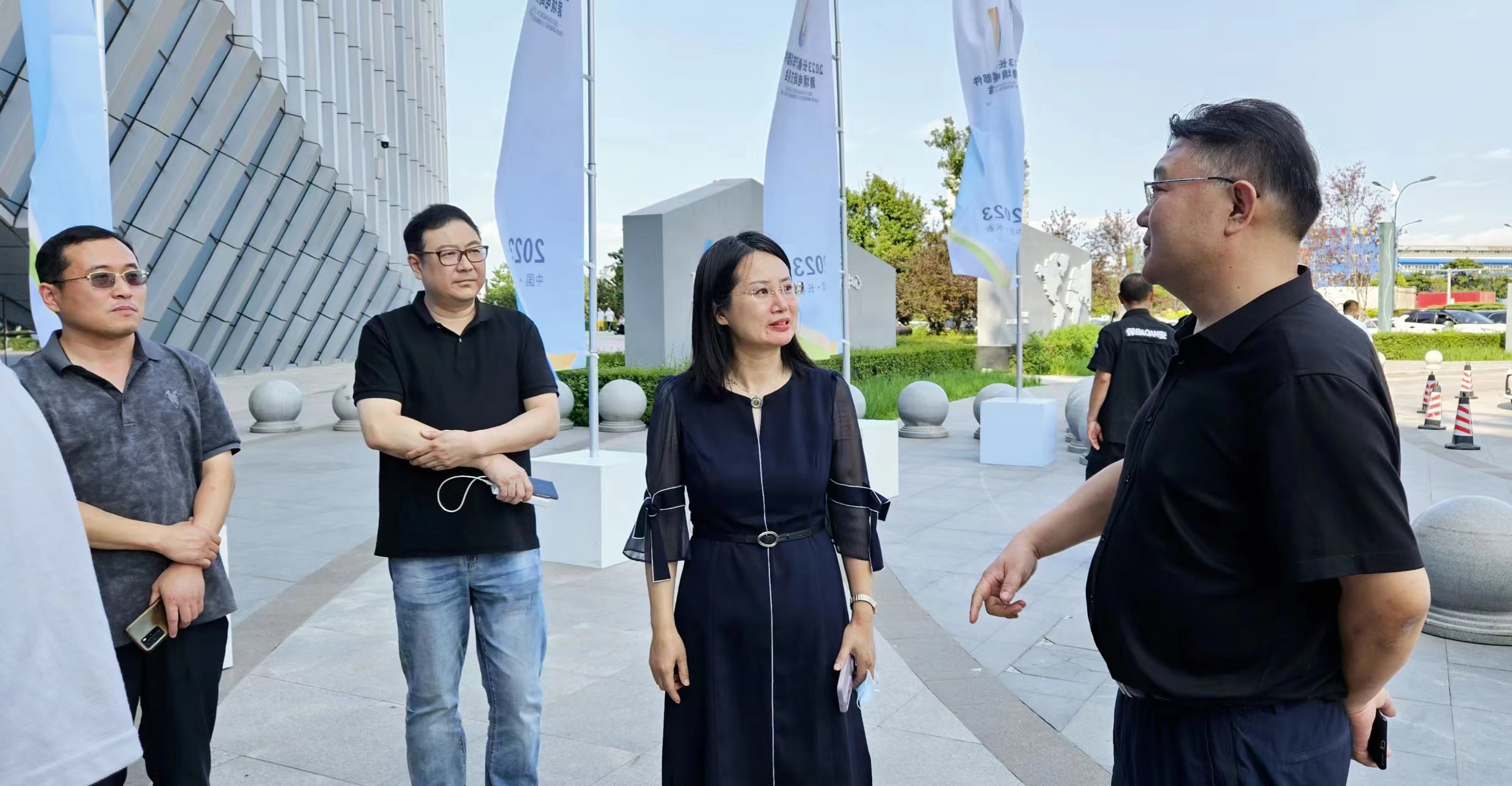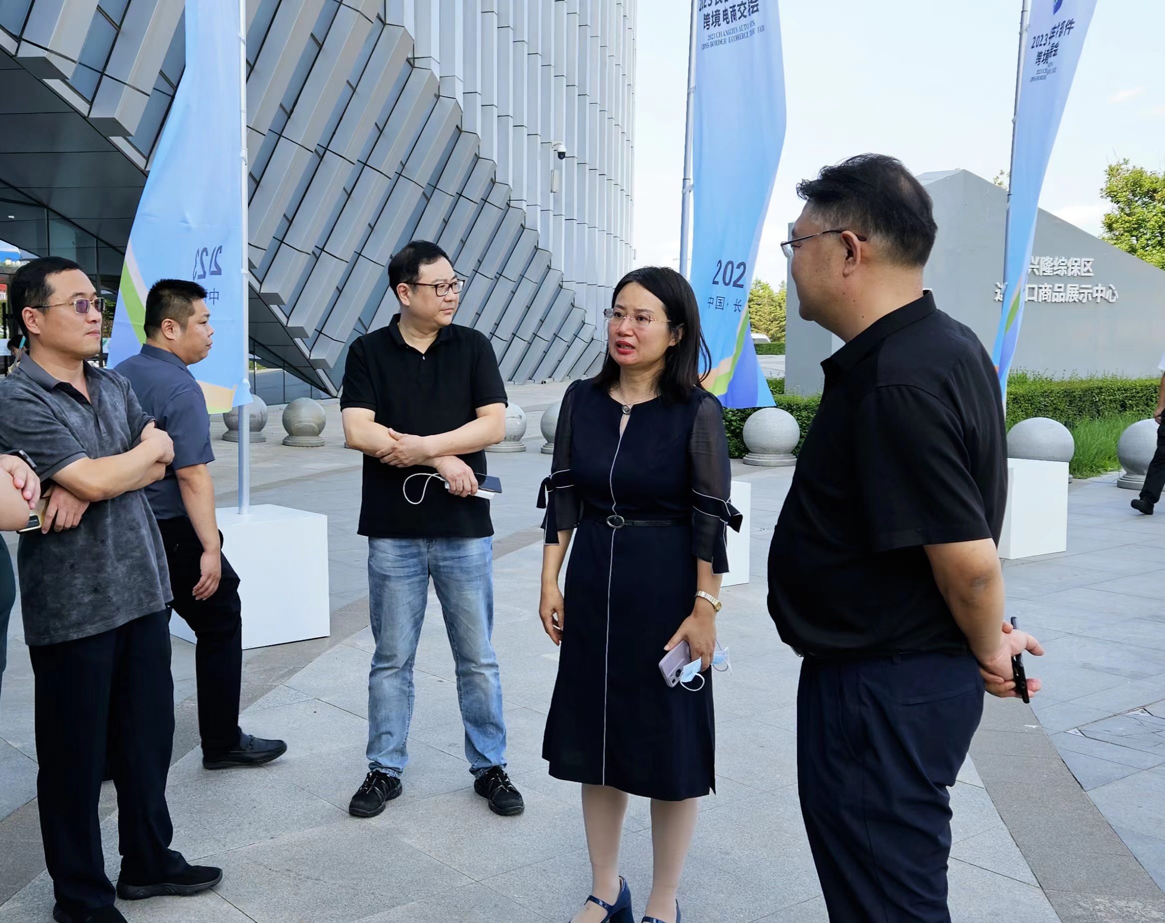 口岸经济局局长杜平为武清区工信局局长张新鹏一行介绍进出口商品展示交易中心