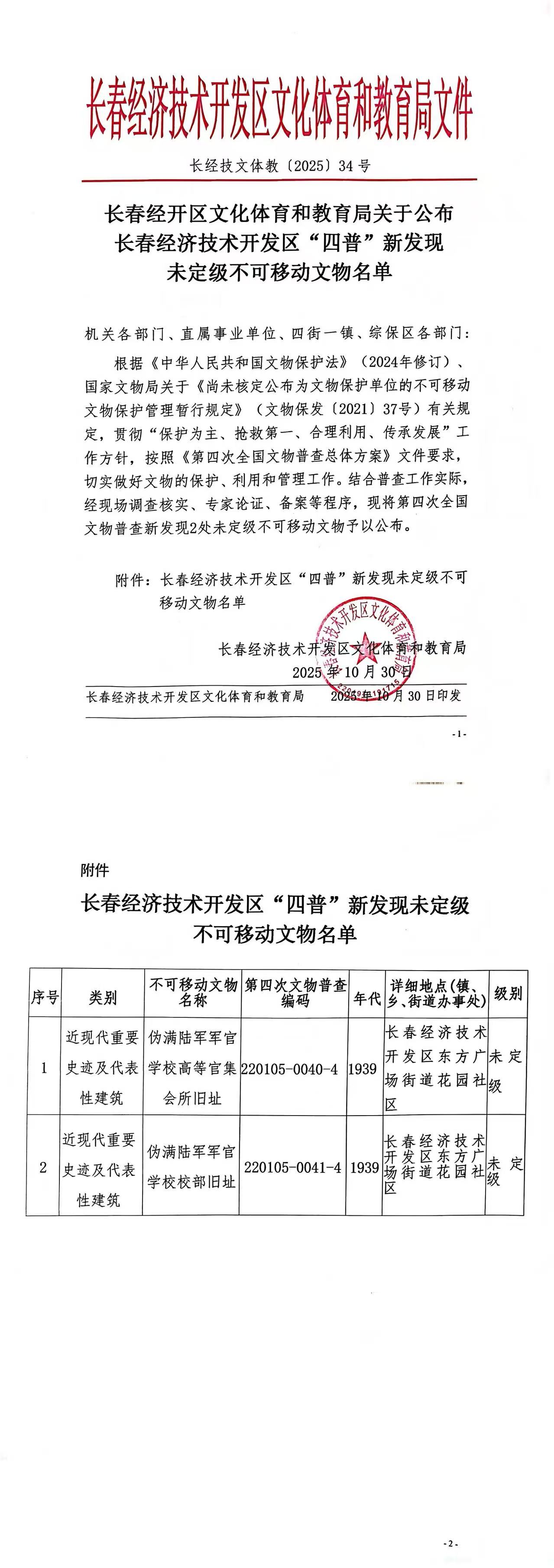 长春经济技术开发区文化体育和教育局关于公布长春经济技术开发区“四普”新发现未定级不可移动文物名单