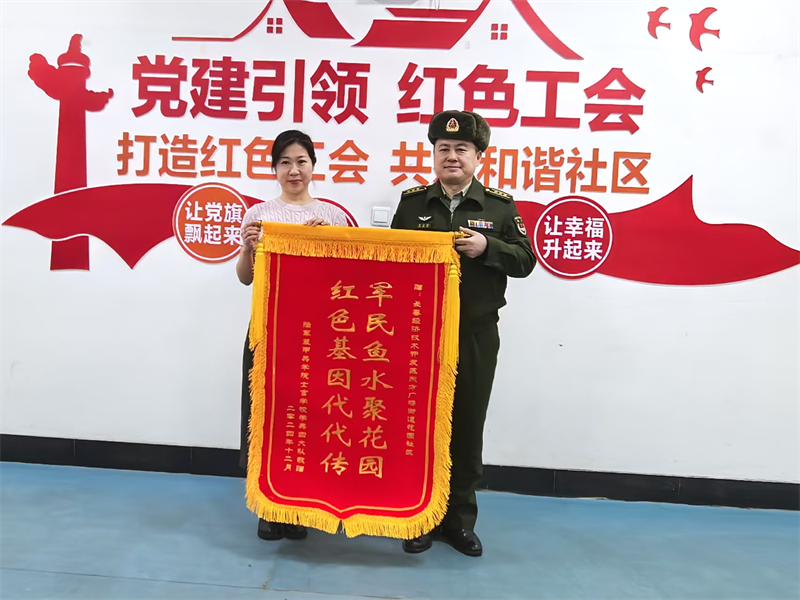 锦旗上的“军民鱼水聚花园-红色基因代代传”,生动体现双方深厚的情谊与合作关系。24日上午,王政委感激地说:“社区所做的一切我们铭记,锦旗代表全体学院师生的心意,感谢支持,希望继续携手续写美好篇章。”社区郑春艳书记也表示,今后会一如既往支持部队建设,巩固深化共建成果,让军民鱼水情更浓更深。