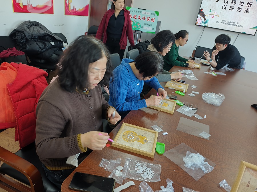 为传承中华优秀传统文化,丰富居民精神文化生活,2026年1月15日下午,苏州社区联合共建单位共同开展“以锦为纸,以珠为语-手工DIY非遗宋锦珍珠画主题活动”,邀请辖区居民共同参与。