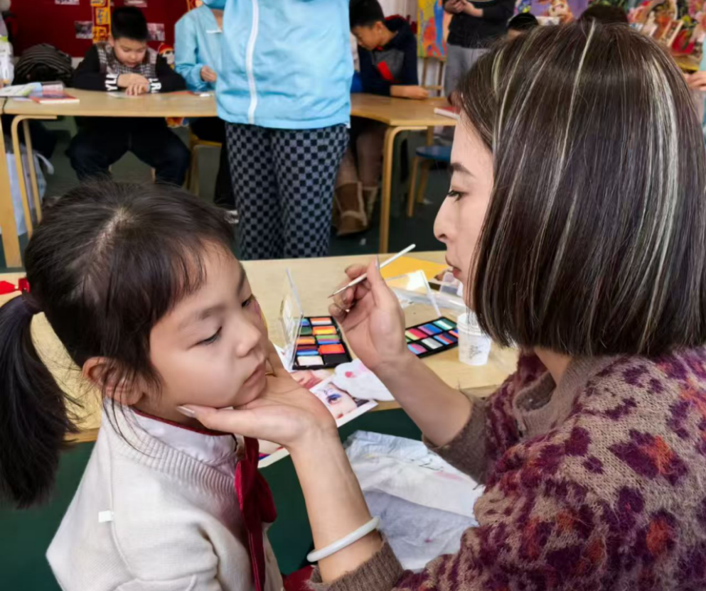 活动当天,森森画室的老师首先为孩子们讲解了京剧脸谱的基本知识——不同色彩代表的性格寓意、经典人物的谱式特点,以及脸谱艺术背后的历史故事。生动的介绍激发了孩子们浓厚的兴趣。在实践环节,每个孩子都领取到空白脸谱模具、颜料和画笔。在老师的悉心指导下,孩子们化身“小小艺术家”,认真勾勒线条、调配颜色。红色代表忠勇,黑色象征刚直,白色体现狡黠……每一种颜色的填充都伴随着对角色理解的加深。活动现场气氛专注而活泼,时而响起“老师,这个颜色怎么调?”“我想画个孙悟空!”的提问与交流声。
