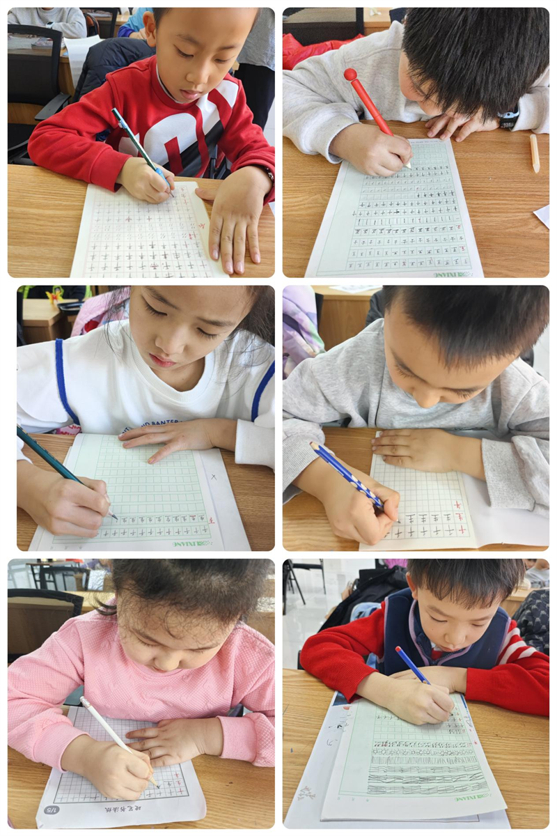 课程从习惯养成入手。初期老师通过示范和个别指导,重点纠正握笔姿势与坐姿,让孩子们体会“身正字端”的关联;随着课程推进,教学更贴近实际书写需求。老师根据不同年龄调整内容:低年级侧重基础笔画,稍高年级则讲解汉字结构与布局,并通过课本书写练习,引导孩子掌握字迹工整、卷面整洁的技巧。课程还设有作品展示环节,让孩子们在交流中互相启发,增强学习的信心与兴趣。