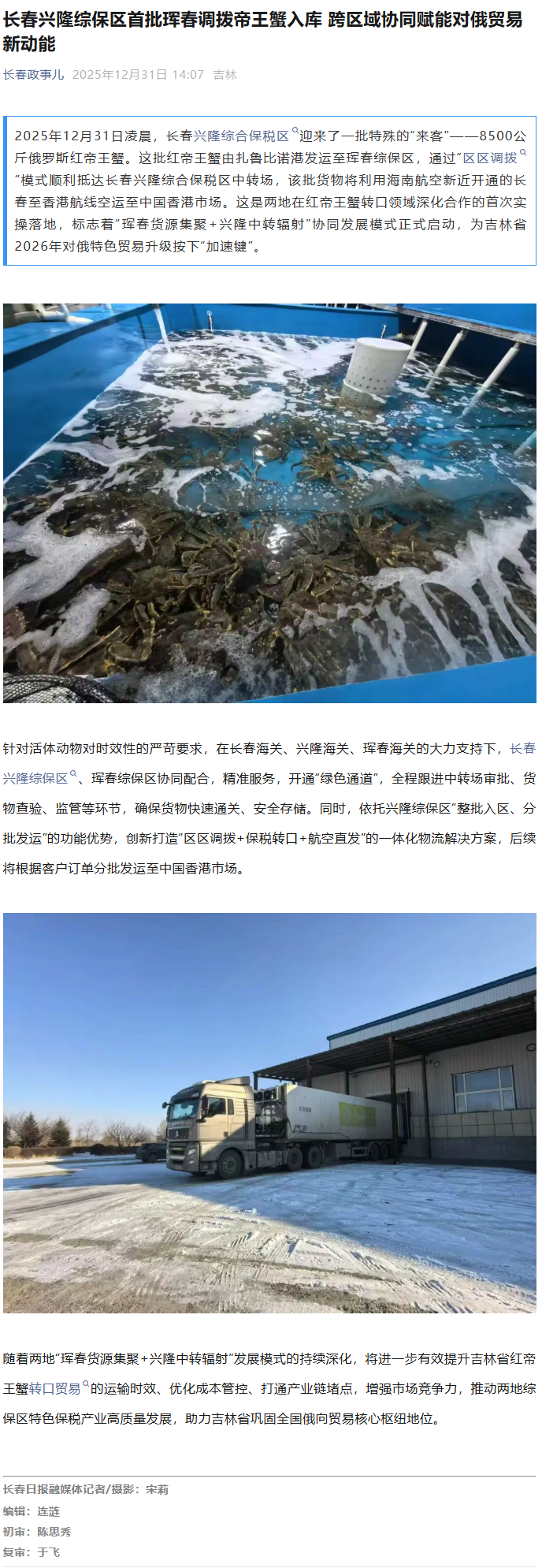 12月31日《长春政事儿》:长春兴隆综保区首批珲春调拨帝王蟹入库 跨区域协同赋能对俄贸易新动能