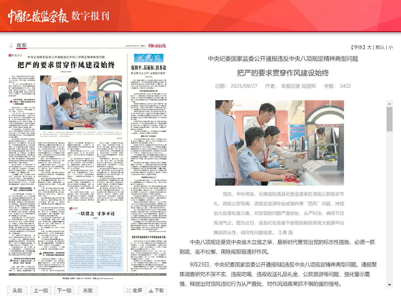 9月23日,中央纪委国家监委公开通报8起违反中央八项规定精神典型问题。通报聚焦调查研究不深不实、违规吃喝、违规收送礼品礼金、公款旅游等问题,强化警示震慑,释放出对顶风违纪行为从严查处、对作风顽疾常抓不懈的强烈信号。
