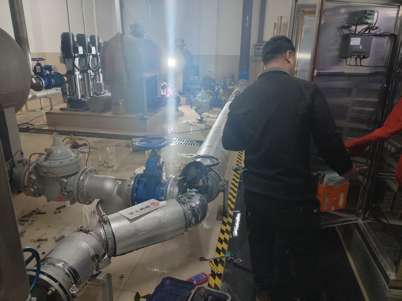 当时正值严寒天气,施工条件艰苦,且院区缺乏专业的管线排查能力,给处置工作带来了不小挑战。为加快进度,经开区立即协调长春市二次供水公司、专业供水检漏单位等多方力量,赶赴现场开展处置工作。工作人员顶着低温、克服地下室空间狭窄等不利因素,现场架设潜水泵抽水,以最快速度缓解积水问题,全力保障院区挂号、诊疗、住院等各项医疗秩序正常运转,牢牢守住了水质安全的第一道防线。