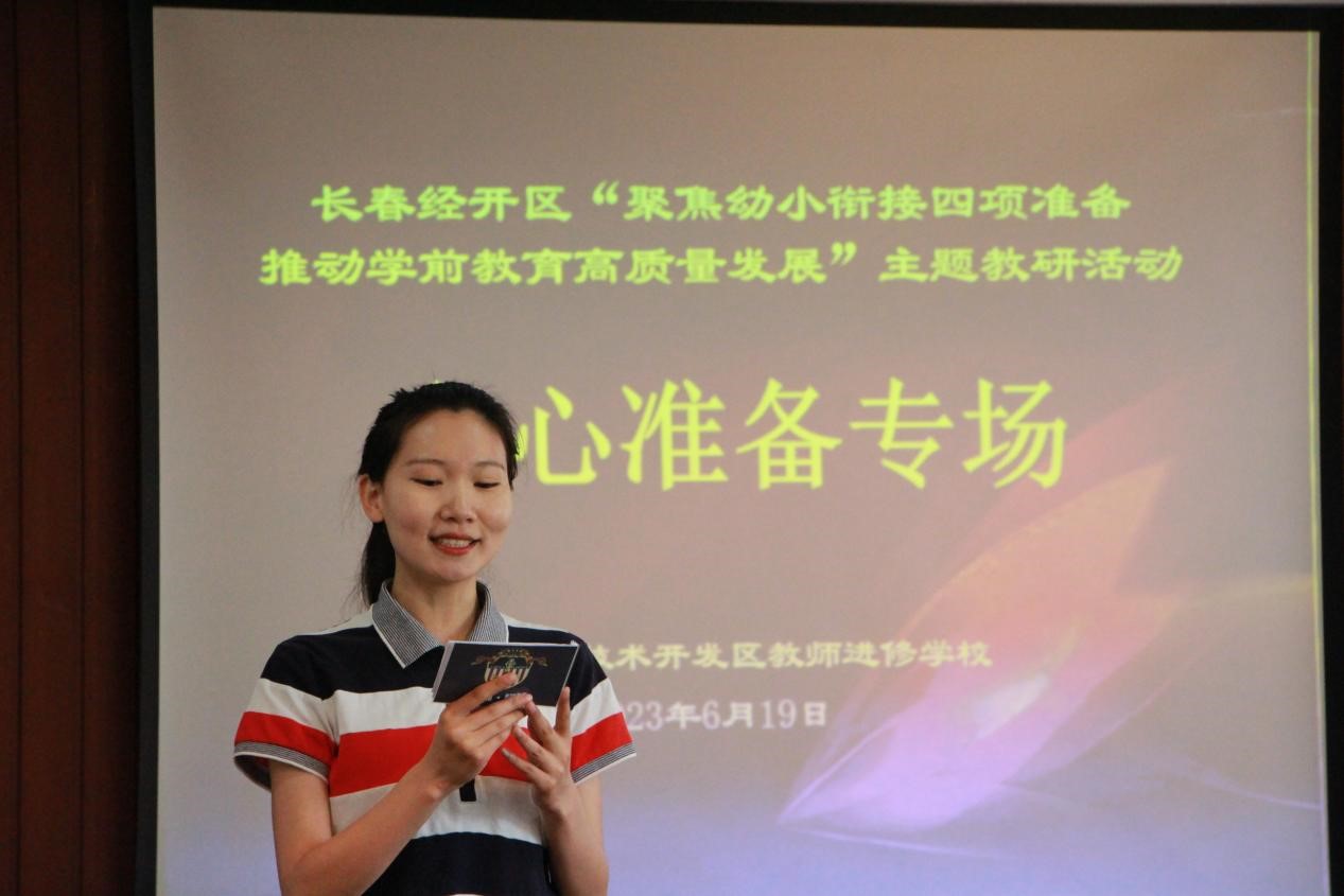 最后,经开区教师进修学校副校长金敬红做总结,金校长首先提出幼儿教师作为幼儿的引导者,教师应熟练掌握《教育部大力推进幼儿园与小学科学衔接的指导意见》《幼儿园入学准备教育指导要点》等文件精神,精准研读,将目标落到实处;二是注重幼儿个性化发展,放大有天赋幼儿的闪光点,注重挖掘其发展潜能;三要在课程的实施过程中关注幼儿之间的互相评价和生成性,在孩子的平价互动中总结提升已有经验,在生成中实现能力迁移。