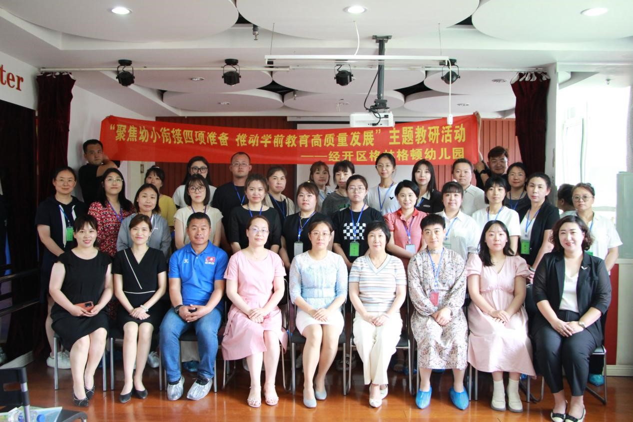 为贯彻《教育部大力推进幼儿园与小学科学衔接的指导意见》及《幼儿园入学准备教育指导要点》文件精神,进一步推进幼小科学衔接,实施科学、有效的入学准备,减缓幼小衔接坡度,并深度研学《幼儿园入学准备教育指导要点》中“身心准备”教育建议的重点内容,调研中心大园区在教师培训、科学研究、主题教研方面的做法和需求,为后续工作部署和活动策划提供科学依据,6月19日,长春经济技术开发区教师进修学校在格林格顿幼儿园举行长春经开区“聚焦幼小衔接四项准备 推动学前教育高质量发展”(身心准备专场)主题教研活动暨联合调研活动。本次活动特邀长春市基础教育研究中心学前部主任白云亲临指导,长春经济技术开发区文化体育和教育局学前科负责人邬飞、教师进修学校副校长金敬红、继教部、干训部、学前部负责人、中心大园区成员园及联盟校的体育学科教师共计32人参与此次活动。