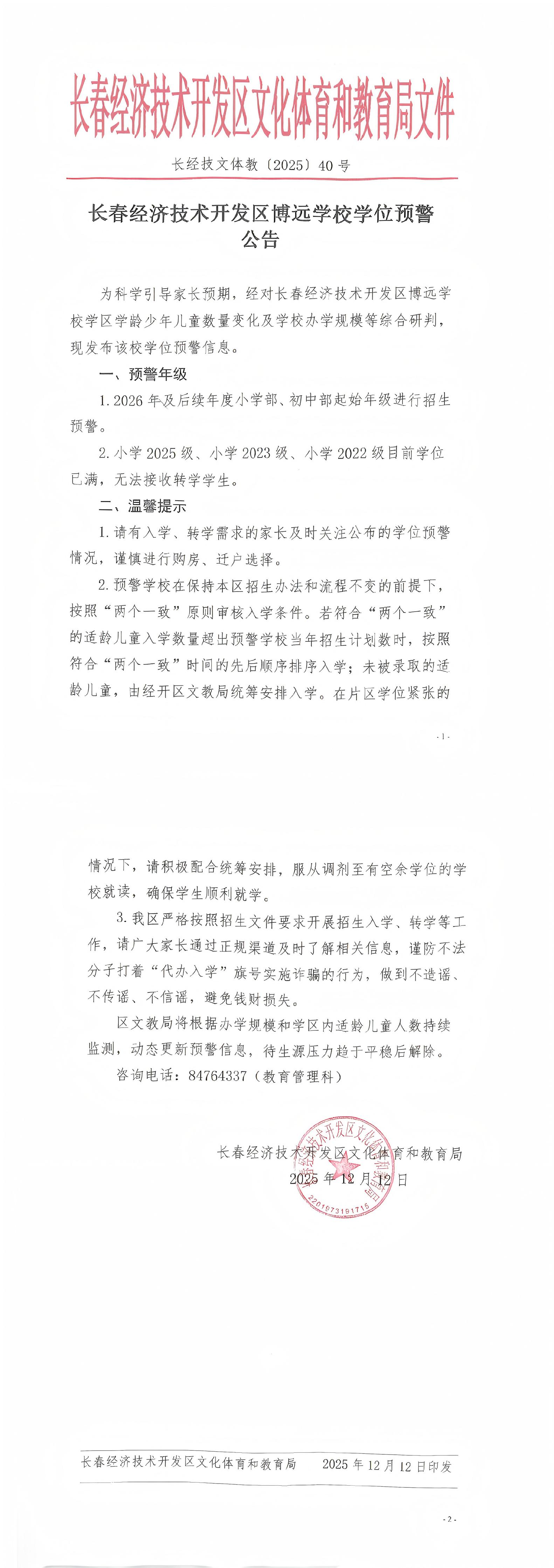 长春经济技术开发区博远学校学位预警公告